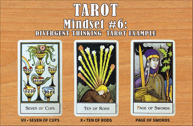 A proficient Tarot reader uses divergent thinking to see connections between cards and present the story the reading is telling. Even one card, such as the Queen of Cups, for example, could represent a loving, maternal figure, the person requesting the reading, or someone who can offer good advice on matters of the heart, or the attitude needed to solve a particular problem. The specific meaning is interpreted using divergent thought and intuition.