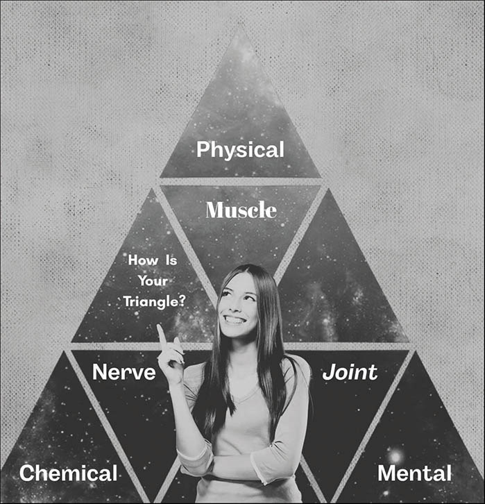 The Triangle of Health. By Dr. Kurt Larsen Most people think being symptom-free means being healthy. But true health is not just the absence of pain or sickness, it’s your body’s ability to Adapt, Heal, and Thrive. One of the best ways to understand this is through what I call the “Triangle of Health.” The first triangle represents three types of stress we face every day: Physical, Mental, and Chemical. When