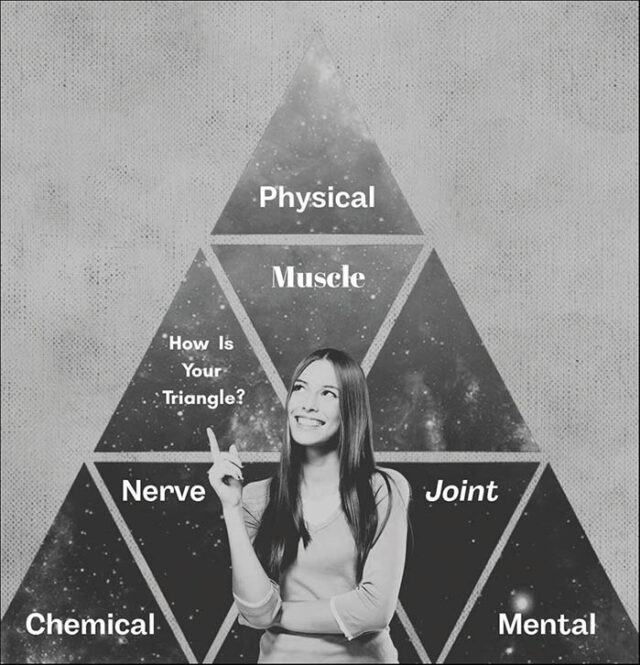 When these stresses pile up, the body stops adapting and starts reacting, and that reaction shows up as symptoms. The second triangle reflects how your body functions: Nerves, Joints, and Muscles. If one side falters, the others strain to keep up, causing imbalance, pain, or fatigue.