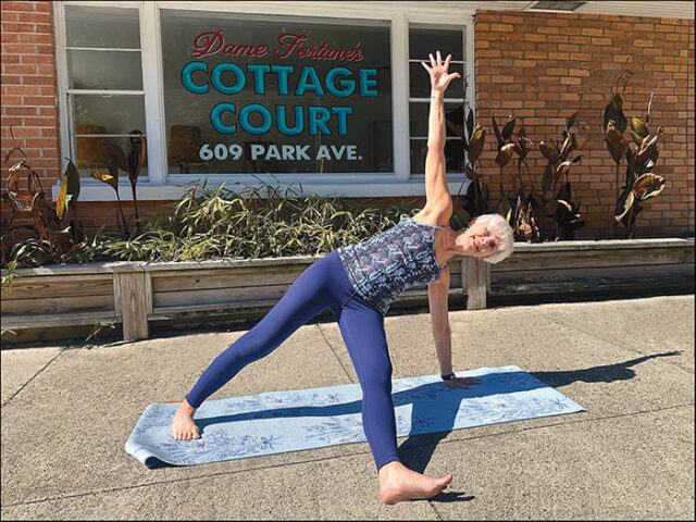 Dame Fortune’s Cottage Court is the setting for Karen Watson Reeves to demonstrate Fallen Triangle Pose. Photo by Fred Padilla.
