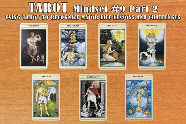 Major Arcana cards beginning with The Devil (XV) and ending with The World (XI) represent challenges to a person’s perceptions, beliefs, identity, and emotions. Mastery of each card brings a person closer to becoming more spiritually evolved. The risk is getting stuck in the card’s lesson for a long time.