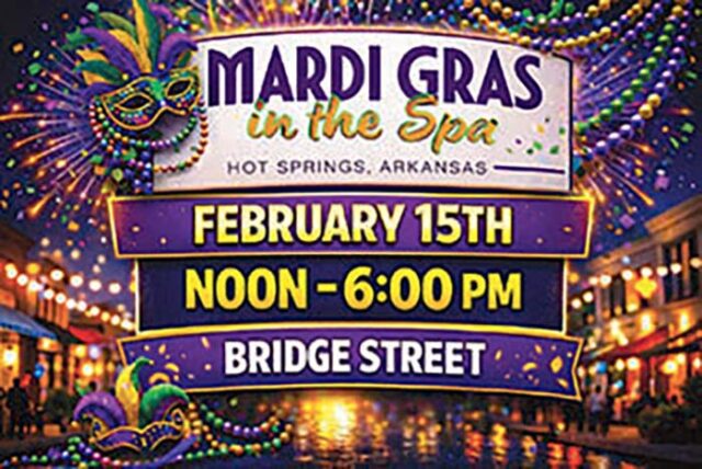 Hot Springs will celebrate the spirit of Mardi Gras on Saturday, February 15, when Mardi Gras in the Spa takes over the Bridge Street Entertainment District from noon until 6:00 p.m. The inaugural event promises a full afternoon of music, costumes, family activities, food, and community celebration — rain or shine.